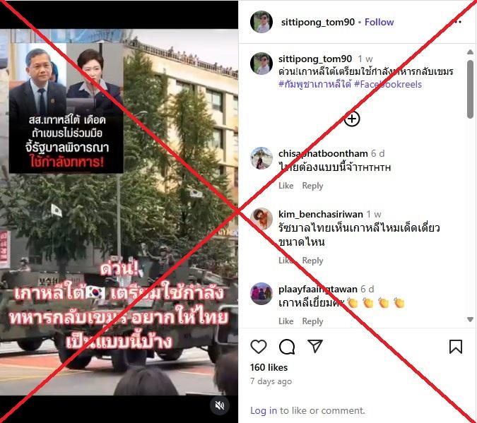 "Breaking! South Korea prepared to use military forces against Cambodia," says Thai-language text superimposed on a video shared on Instagram on October 14, 2025.