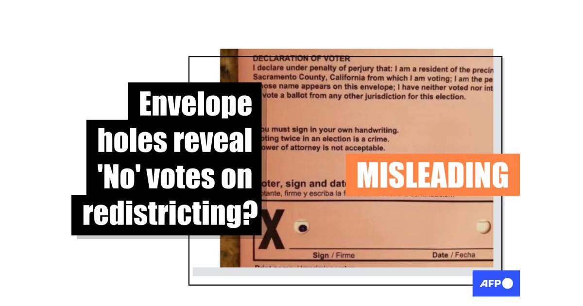 Californians are voting in a special election on Proposition 50, an amendment to the state's constitution that would temporarily change congressional district maps ahead of the 2026 US midterm elections. But videos and pictures claiming mail ballot return envelopes were specifically designed to make a "no" vote easily visible and allow for tampering are misleading; the secretary of state and an independent expert say holes have been punched in the envelopes for several election cycles to make voting more accessible for those with visual impairments and that the ballots can be folded to prevent any markings from showing.