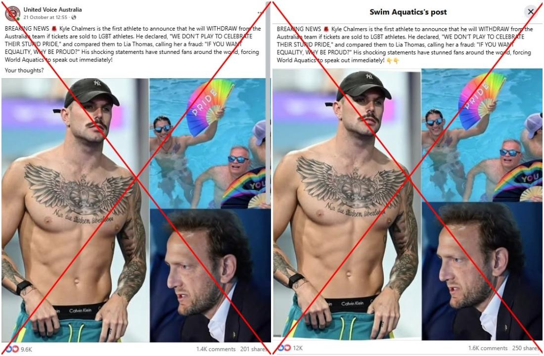 Fabricated quotes attributed to athletes on LGBTQ issues continue to gain traction online, with Australian swimmer Kyle Chalmers being the most recent target. Baseless posts allege he threatened to withdraw from the national team while criticising "stupid pride". Australia's top swimming body refuted the claim and said it had asked Meta to take down the accounts where the falsehood originated.