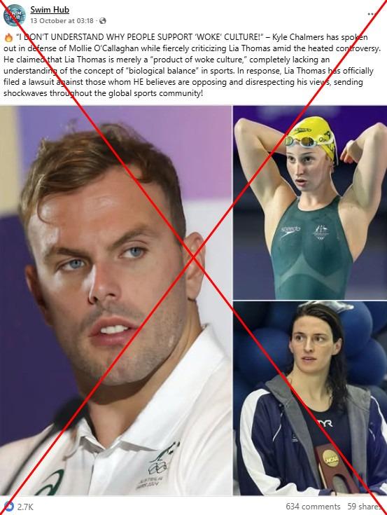 The same claim also appeared on a US-based Facebook page called Swim Aquatics, while another Facebook page Swim Hub claimed Chalmers had said Thomas was "a product of woke culture". Both posts have since been taken down.
