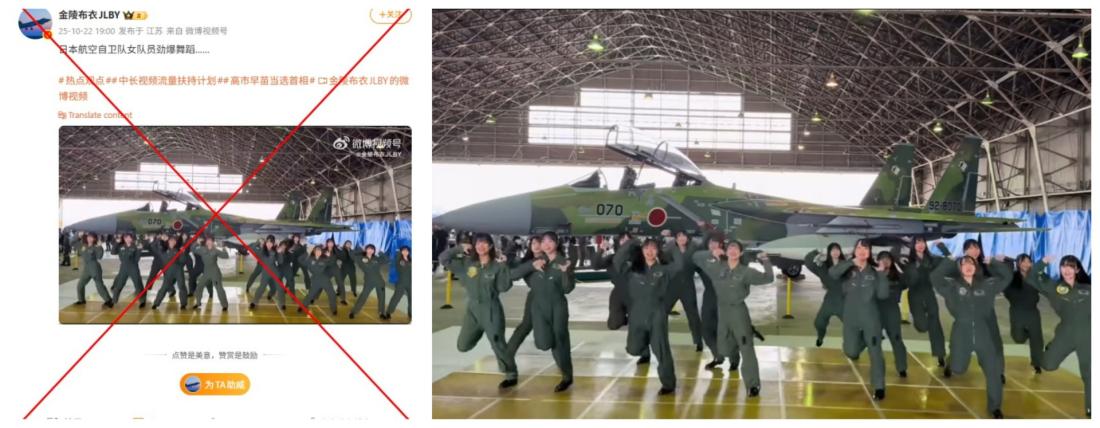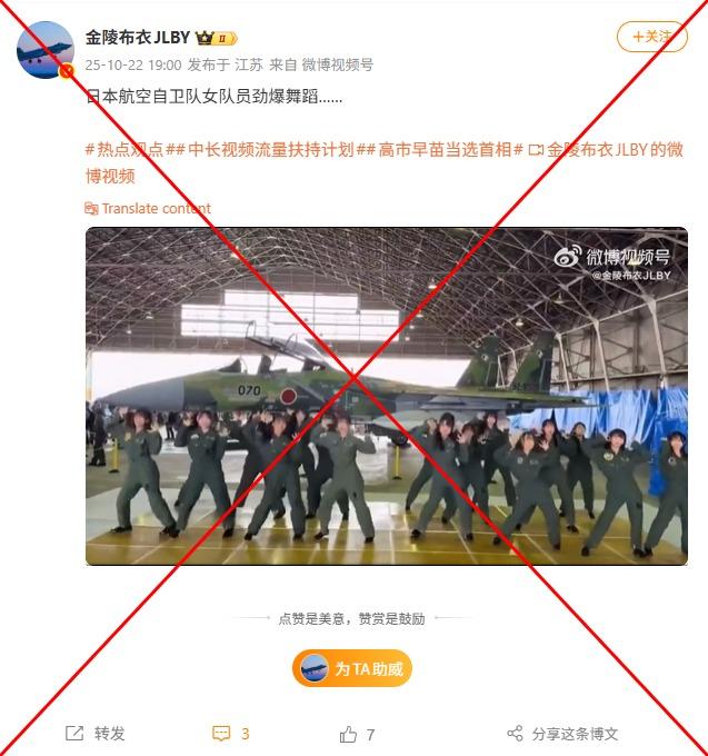 "Female members of Japan's Air Self-Defense Force perform a powerful dance," reads the simplified Chinese caption on a Weibo post shared October 22, 2025.