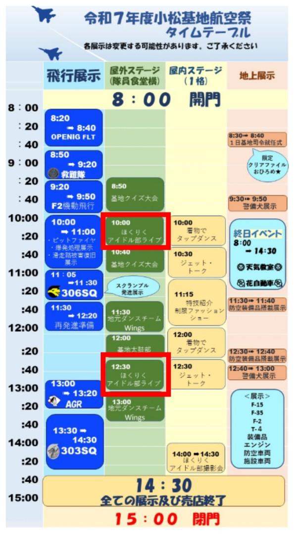 On the Japan Air Self-Defense Force's website, the timetable of the festival on October 5 showed displays of its fighter jets and the performance by Hokuriku Idolbu (archived link).