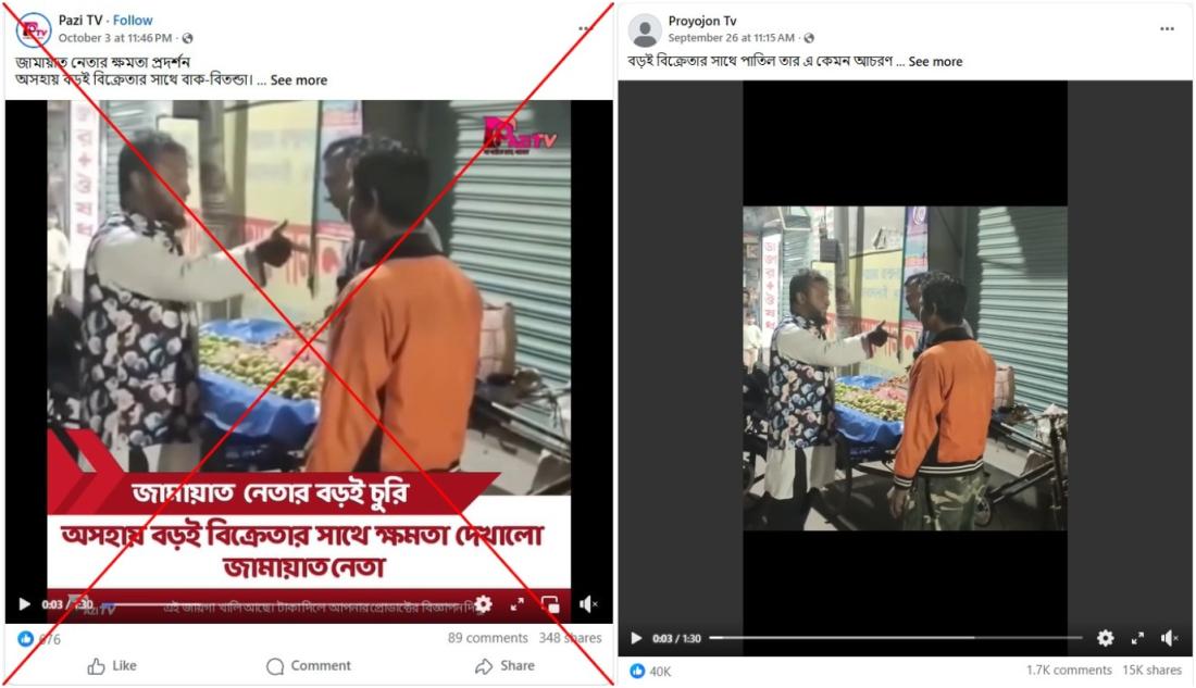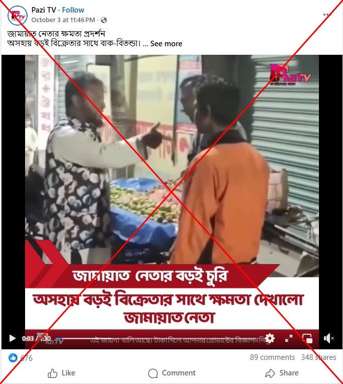 The video supposedly showing a Jamaat leader extorting money from a fruit vendor has been shared elsewhere on Facebook and on Instagram.