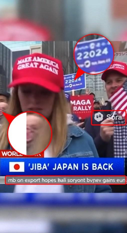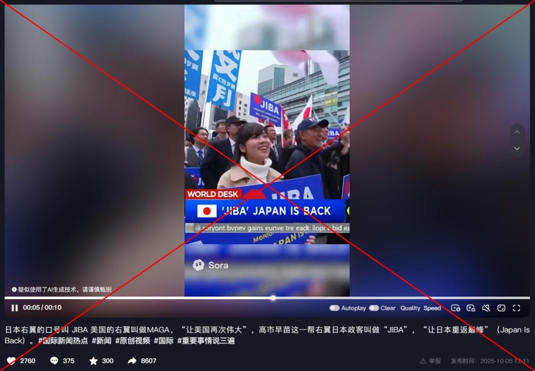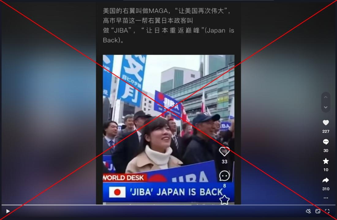 Japan's new Prime Minister Sanae Takaichi has revived the slogan "Japan is back" during her party leadership campaign, but there is no evidence the phrase has been popularly shortened to "JIBA" contrary to online posts. A supposed news report depicting Takaichi's supporters holding "JIBA" banners spread widely among Chinese social media users, who mocked the acronym for resembling a Chinese insult word. The clip is in fact AI-generated.