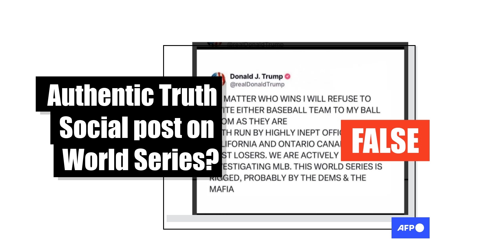 Donald Trump's strained relationships with leaders in Ontario and California prompted many social media users to claim the US president said the Major League Baseball (MLB) World Series was "rigged" and that he would refuse to host either the Toronto Blue Jays or the Los Angeles Dodgers at the White House. But the supposed Truth Social post is fabricated; there is no record of Trump making any such announcement on social media or in any public statement.