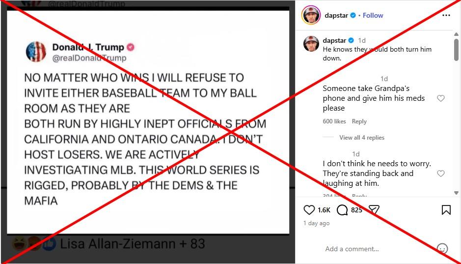 "NO MATTER WHO WINS I WILL REFUSE TO INVITE EITHER BASEBALL TEAM TO MY BALL ROOM AS THEY ARE BOTH RUN BY HIGHLY INEPT OFFICIALS FROM CALIFORNIA AND ONTARIO CANADA," reads the alleged capture of a Truth Social post from Trump.
