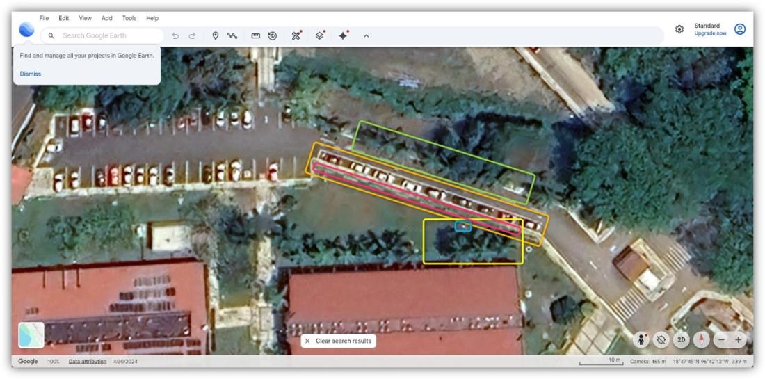 Google Street View and Google Earth satellite images show a road on the university's campus that appears to match the location, with similar street parking spots, lamp posts, palm trees and bushes (archived here and here).