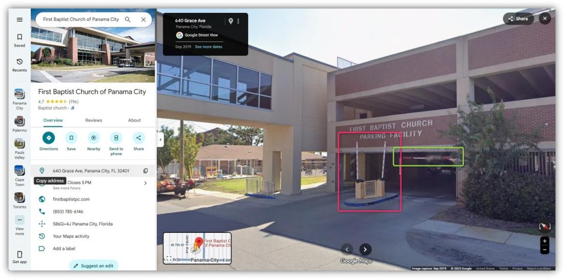 AFP geolocated the parking lot meter shown to a garage for the First Baptist Church of Panama City (archived here).