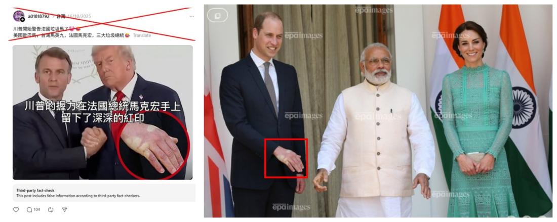 Muscular handshakes between US President Donald Trump and his French counterpart Emmanuel Macron, where neither man appears willing to show a hint of weakness, have frequently drawn global attention. After the pair met in Egypt in October 2025, online posts shared an image they falsely claimed depicted Macron's hand drained of colour from Trump's strong grip. The picture is from an unrelated event and features the hand of Britain's Prince William.