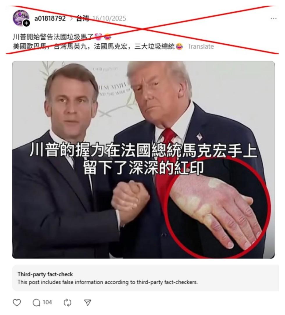 The image of the reddened hand, added to a photo of Macron and Trump during a lightning summit in Egypt meant to cement a ceasefire in Gaza, was shared on Threads on October 16, 2025 (archived link).