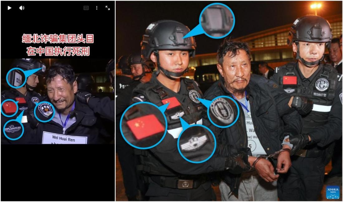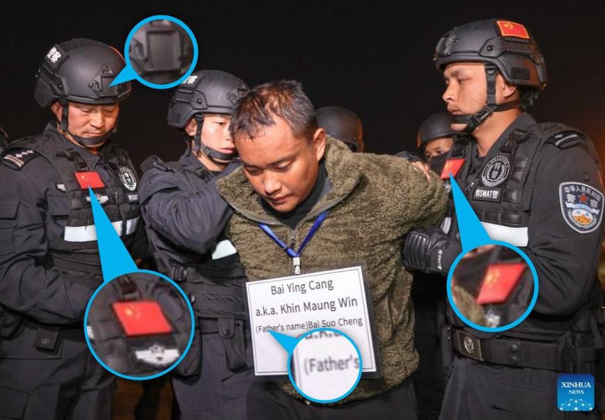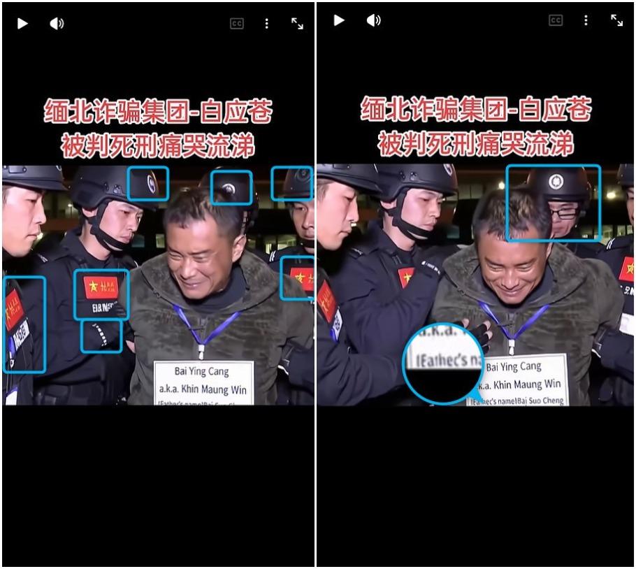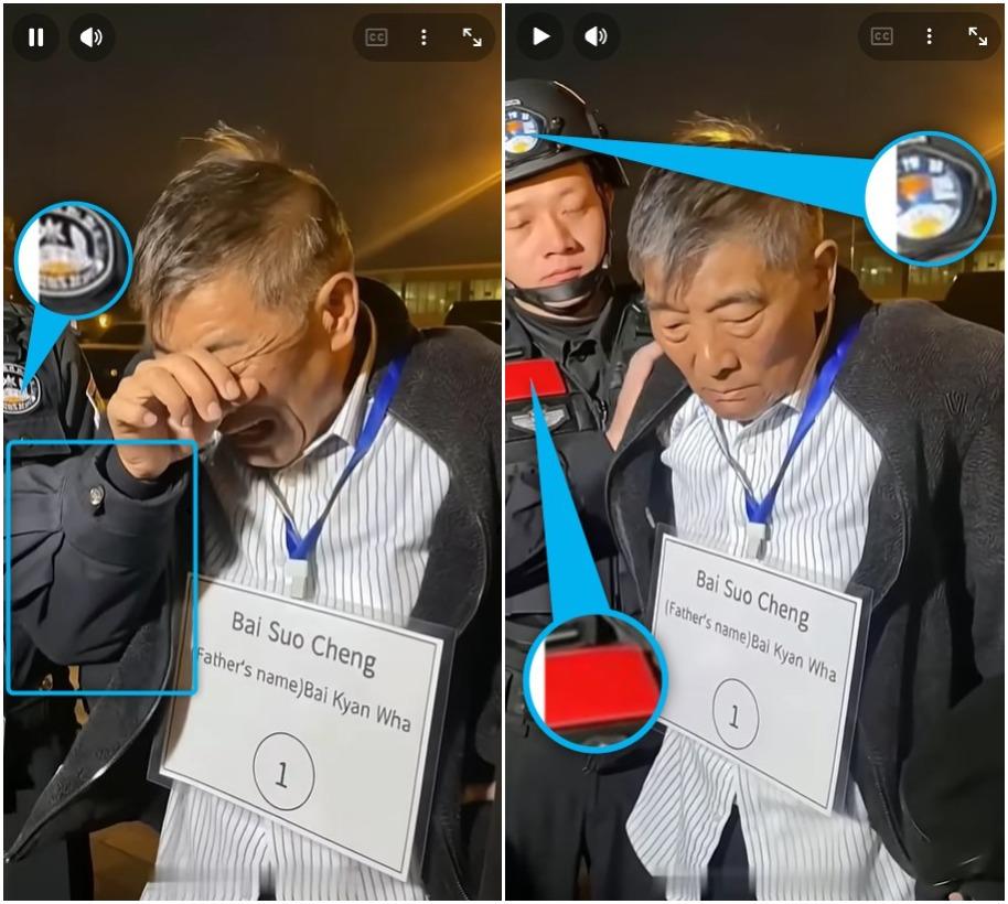 Meanwhile, the video of Bai Ying Cang contains distorted Chinese flag badges on the officers' uniforms. The word "Father's" on the card Bai is wearing is misspelled as "Eathec's". There is an unknown logo on the officers' helmets.