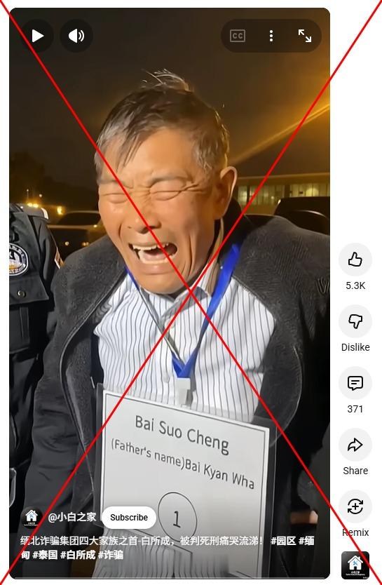 "Bai Suo Cheng, the head of one of the four major fraud syndicates in northern Myanmar, was sentenced to death and wept bitterly!" reads the simplified Chinese caption of a YouTube video on October 5, 2025.