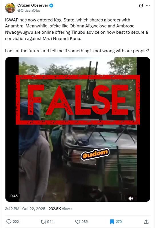 “ISWAP has now entered Kogi State, which shares a border with Anambra,” reads a part of an X post published with a video on October 22, 2025.