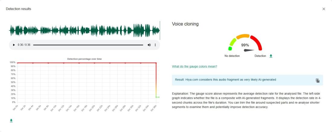 AFP extracted the audio from the first half of the video and ran it through the Hiya.com voice-cloning detection tool within the Verification Plugin, also known as InVID-WeVerify, which assessed it was "very likely AI-generated".