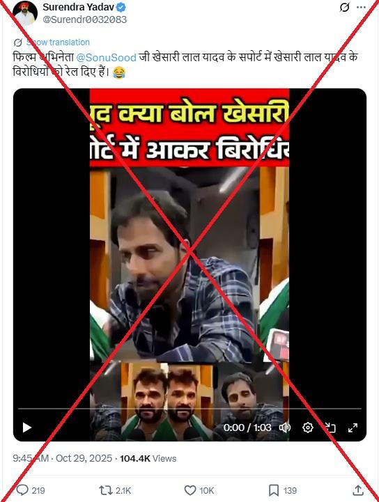 The video appearing to show Bollywood actor Sonu Sood endorsing actor-turned-politician Khesari Lal Yadav in the upcoming Bihar state assembly elections was shared on X on October 29, 2025.