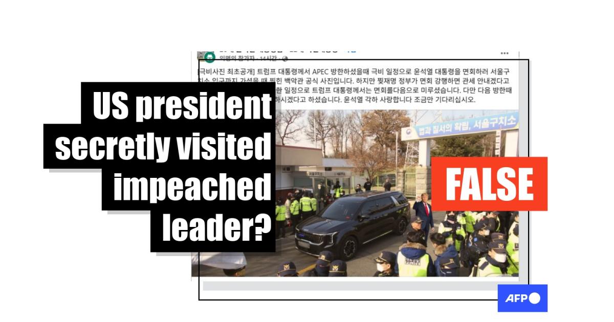 Supporters of South Korea's jailed ex-leader Yoon Suk Yeol openly called for US President Donald Trump to meet the former president when he attended the APEC summit in late October, but social media users claiming Trump made a "secret trip" to the Seoul Detention Center shared an altered image. The image was created by superimposing a picture of the US president over a months-old, unrelated photo of Yoon's motorcade.