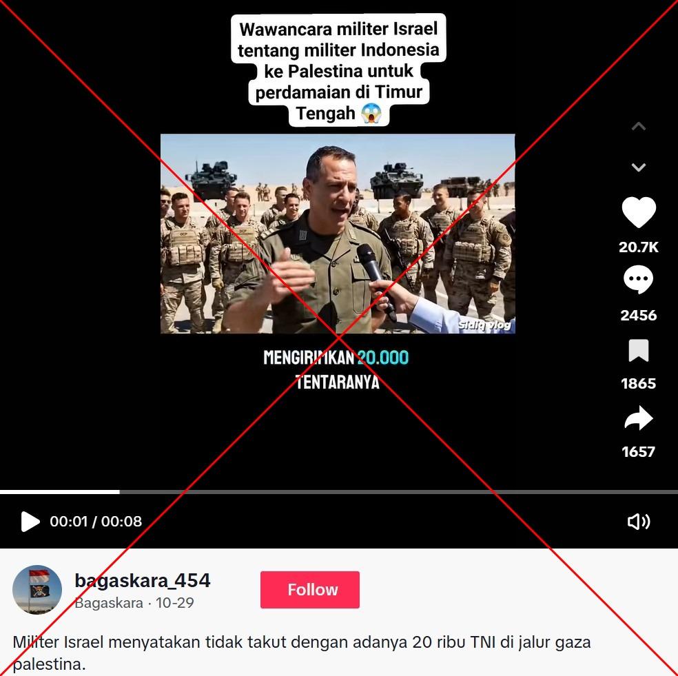 "An interview with Israeli military about Indonesia sending its army to Palestine for peace in the Middle East," says Indonesian-language text overlaid on a TikTok video shared October 29, 2025.