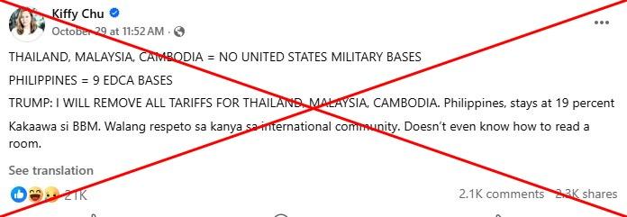 Her post, which has racked up more than 2,300 shares, suggests the Philippines did not receive preferential treatment despite having "9 EDCA bases" compared to its neighbours with no US military bases.