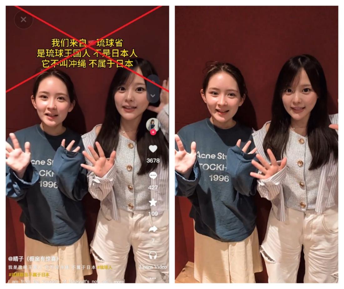 A similar Douyin clip shared on October 31 shows two Japanese-speaking women in front of a red wall with superimposed simplified Chinese text that reads: "I am Ryukyuan, not Japanese. Its name isn't Okinawa. It doesn't belong to Japan."
