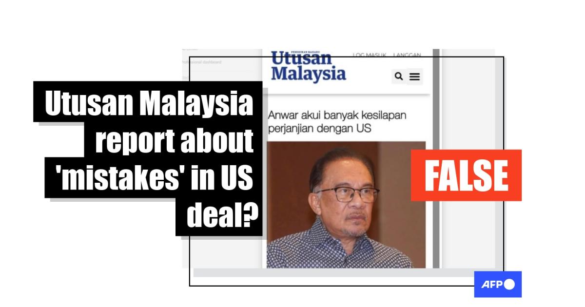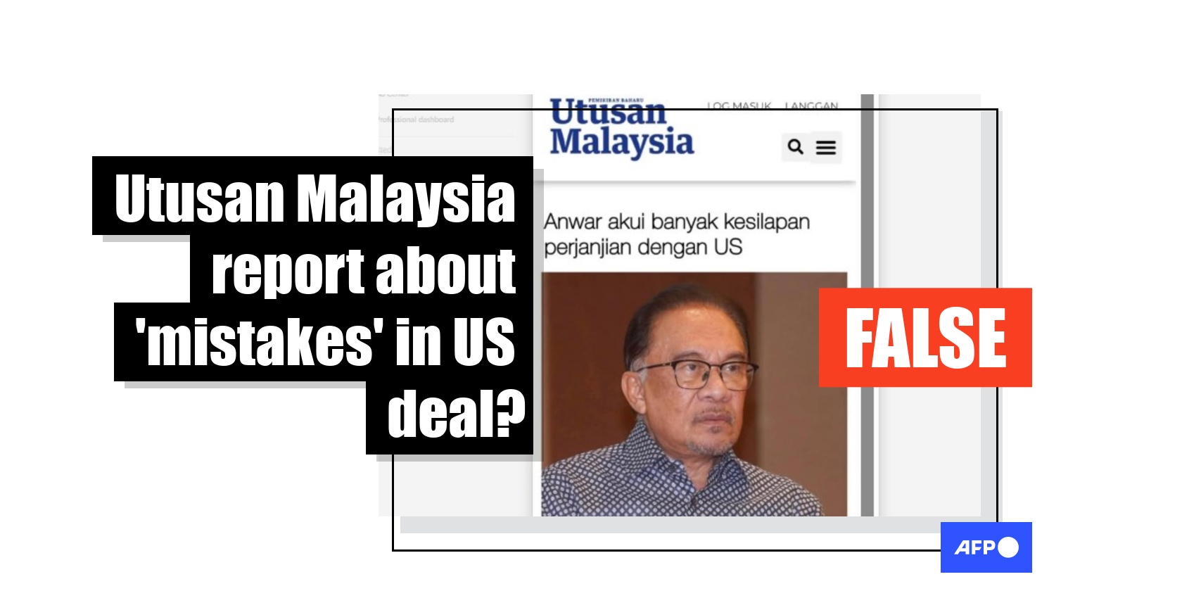 Malaysian Prime Minister Anwar Ibrahim signed a trade deal with US President Donald Trump in October, which opposition parties and some ruling coalition members have criticised for being unfair towards Malaysia. Posts slamming Anwar soon surfaced online, sharing a fabricated news report that falsely claims the leader admitted to "many mistakes" in the agreement. The Malay-language Utusan Malaysia newspaper has disowned the article, and there is no trace of it on the paper's official channels.