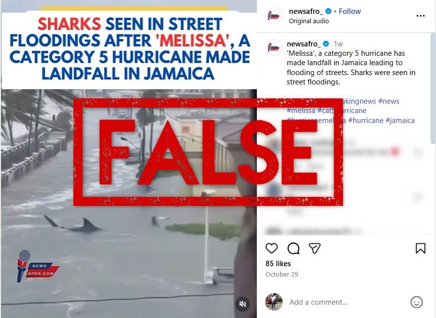 “‘Melissa’, a category 5 hurricane has made landfall in Jamaica leading to flooding of streets. Sharks were seen in street floodings (sic),” reads the caption of an Instagram post published on October 29, 2025.