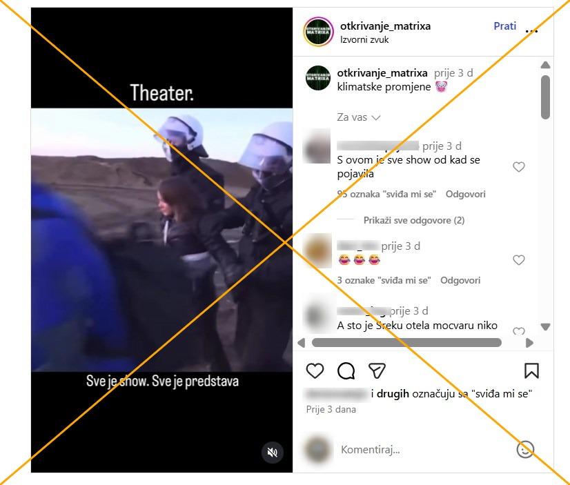 "Everything is a show. Everything is a performance", says the description of a video posted on Instagram on November 10, 2025 that has been viewed over sixty thousand times so far. In the video, Greta Thunberg appears to be held by police officers and smiles as they escort her. The same video was also posted on the user's Facebook profile.