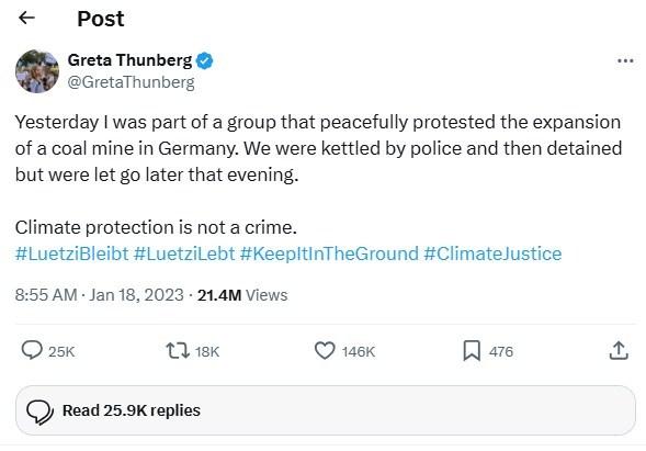 On January 18, 2023, Greta Thunberg addressed the protest on her X profile, describing the events from her perspective. She wrote: “Yesterday I was part of a group that peacefully protested the expansion of a coal mine in Germany. We were kettled by police and then detained, but were let go later that evening.”