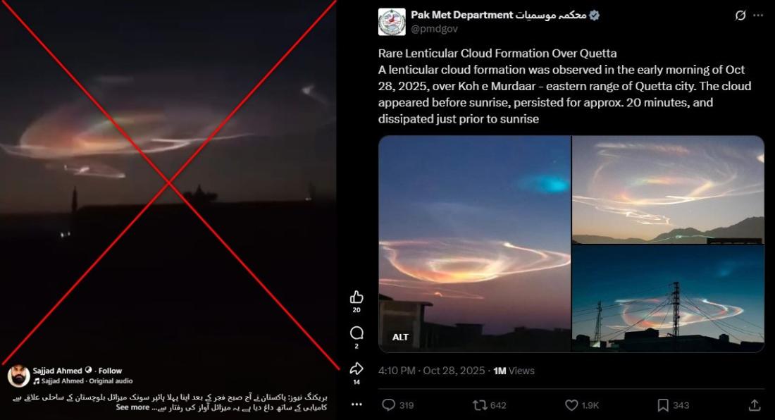 In an X post on October 28, the Pakistan Meteorological Department shared three similar photos showing the formation in the sky, and said it showed a "rare lenticular cloud formation" over the eastern city of Quetta observed the same day (archived link).