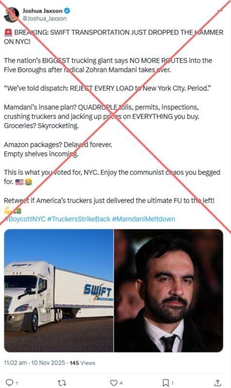 "BREAKING: SWIFT TRANSPORTATION JUST DROPPED THE HAMMER ON NYC! The nation's BIGGEST trucking giant says NO MORE ROUTES into the Five Boroughs after radical Zohran Mamdani takes over," reads a November 10, 2025 X post.