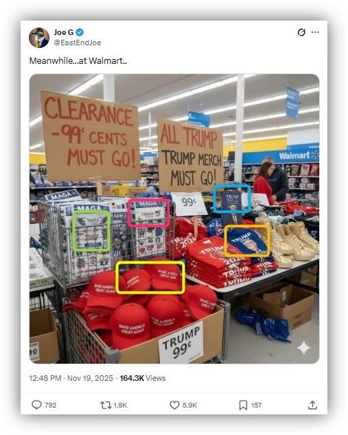 But the picture claiming to show Walmart marking down Trump-themed merchandise is an AI-generated fake.