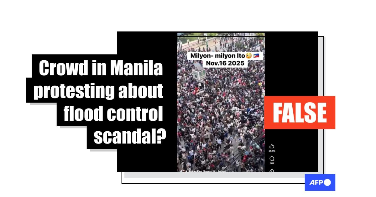 Public anger over a spiralling flood control scandal involving Philippine officials and lawmakers was reflected in the huge crowds that attended an anti-corruption rally in Manila in mid-November, but a video that social media posts claimed showed the protest was in fact filmed in Nepal months earlier. The user who originally posted the video told AFP it was filmed near his office in Kathmandu during a deadly uprising that toppled the country's government in September.