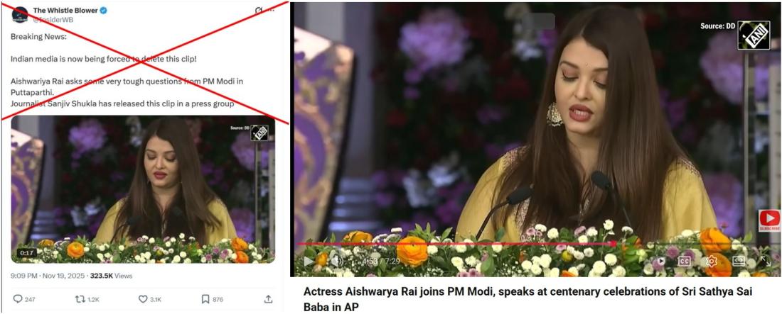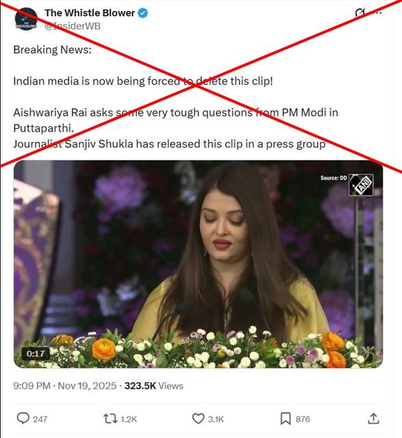 "Breaking News: Indian media is now being forced to delete this clip! Aishwarya Rai asks some very tough questions from PM Modi in Puttaparthi," reads part of the caption of an X video that has been viewed 327,000 times since it was shared on November 19, 2025.