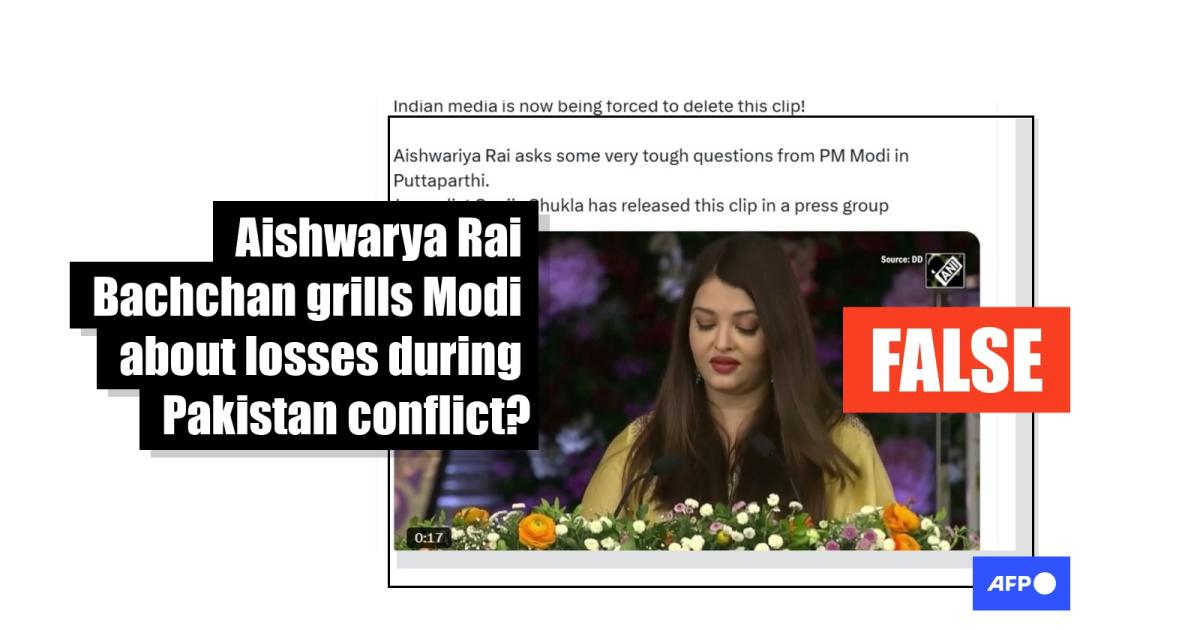 Months after deadly border clashes between India and Pakistan, an altered video was shared in social media posts falsely claiming it showed Bollywood star and former Miss World Aishwarya Rai Bachchan confronting Prime Minister Narendra Modi about the alleged loss of military assets. The video was manipulated from footage of her speech at the centenary celebrations of an Indian spiritual guru in late November, where she made no mention of the conflict.