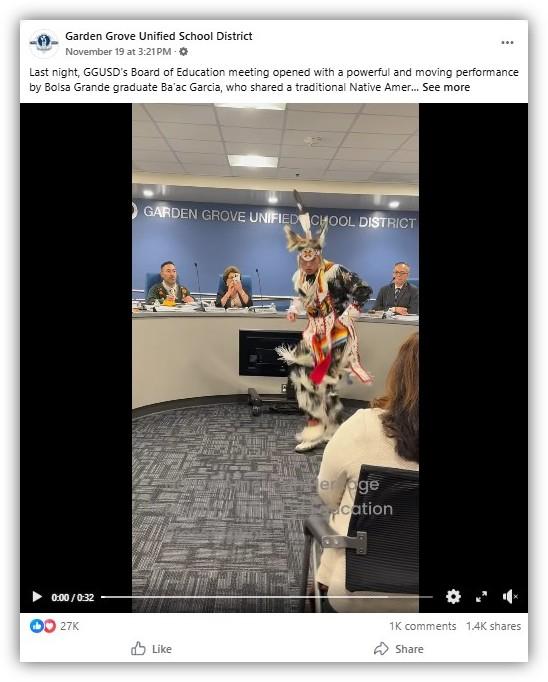 "Last night, GGUSD's Board of Education meeting opened with a powerful and moving performance by Bolsa Grande graduate Ba'ac Garcia, who shared a traditional Native American dance in honor of Native American Heritage Month," the school district captioned its posts.