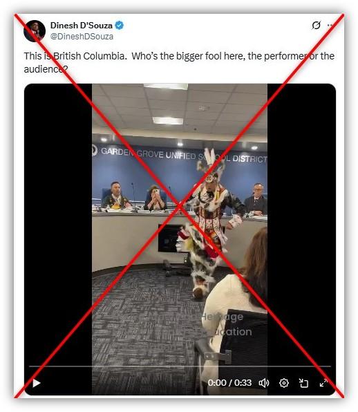 Canadian and US social media users are claiming a video shows a man in traditional regalia dancing at a government assembly in British Columbia following a landmark court case in the Canadian province concerning Indigenous land rights. This is false; the footage comes from the US state of California, where a local school district welcomed one of its high school graduates to open a November 2025 board of education meeting with a performance for Native American Heritage Month.