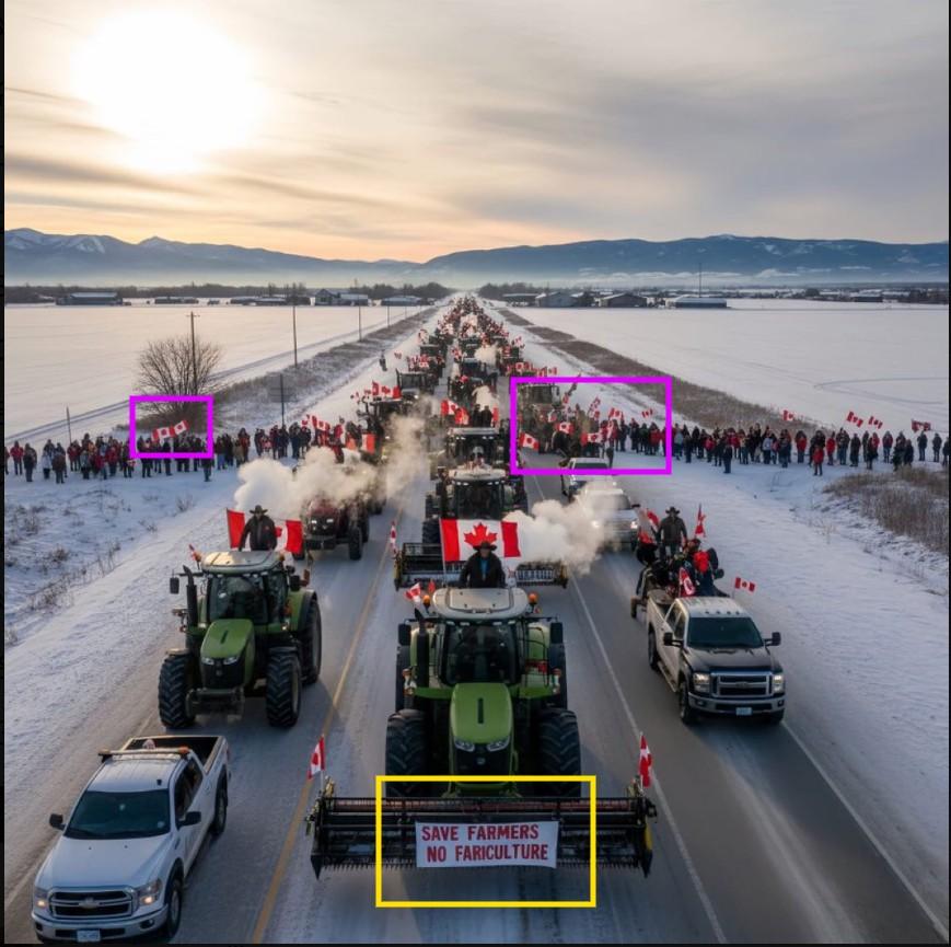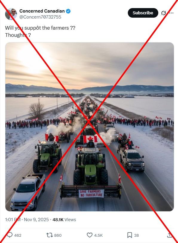 Protests advocating for greater agricultural sovereignty sprung up in Canada in November 2025, but some images spreading on social media of an apparent tractor roll demonstration were generated by artificial intelligence. Warped details indicate the visuals are synthetic -- and one account pushing them is a Pakistan-based page impersonating a Canadian public figure.
