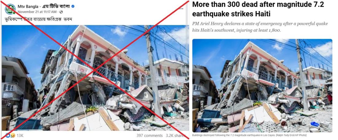 A reverse image search on Google found the first falsely shared photo had previously been used in an Al Jazeera report from August 14, 2021 about a deadly 7.2-magnitude quake in Haiti that reduced buildings to rubble (archived link).