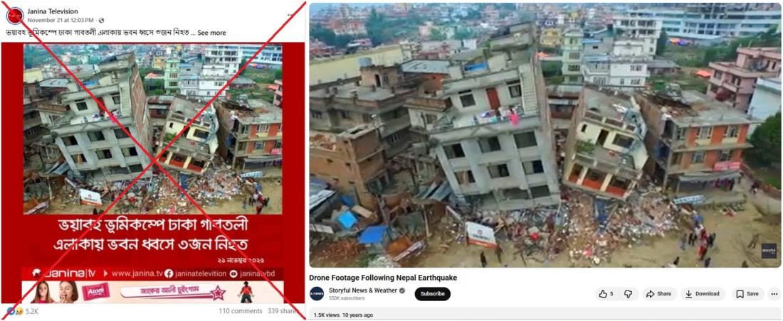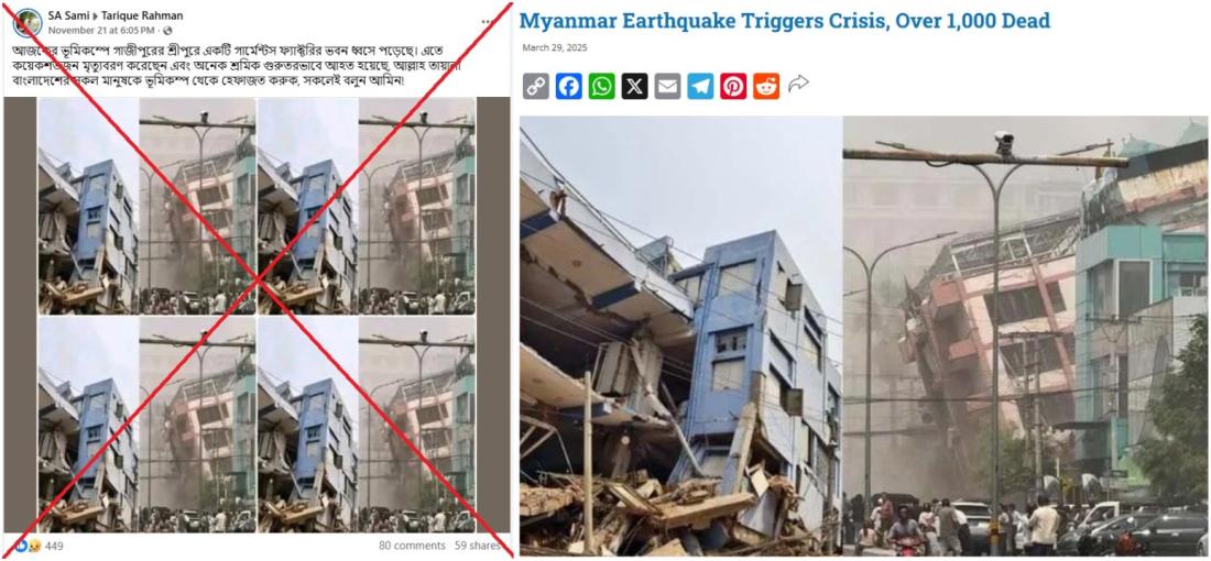 After a powerful earthquake struck outside Bangladesh's crowded capital Dhaka on November 21, images were shared in posts falsely claiming they show buildings destroyed by the 5.5-magnitude tremor. The buildings were in fact damaged during devastating quakes in Nepal in April 2015, Haiti in August 2021, and Myanmar in March 2025 and shown in news reports at the time.