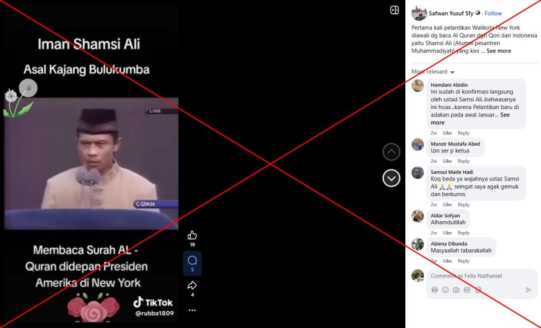 "For the first time, the inauguration of the Mayor of New York was opened with a Koran recitation by an Indonesian imam, Shamsi Ali (an alumnus of a Muhammadiyah boarding school), who now serves as a senior imam in New York," reads the Indonesian-language caption on a Facebook video posted on November 6, 2025.