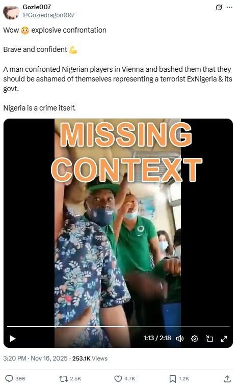 “Wow, explosive confrontation. Brave and confident. A man confronted Nigerian players in Vienna and bashed them that they should be ashamed of themselves representing a terrorist ExNigeria & its govt. Nigeria is a crime itself”, reads the caption of an X post shared on November 16, 2025.