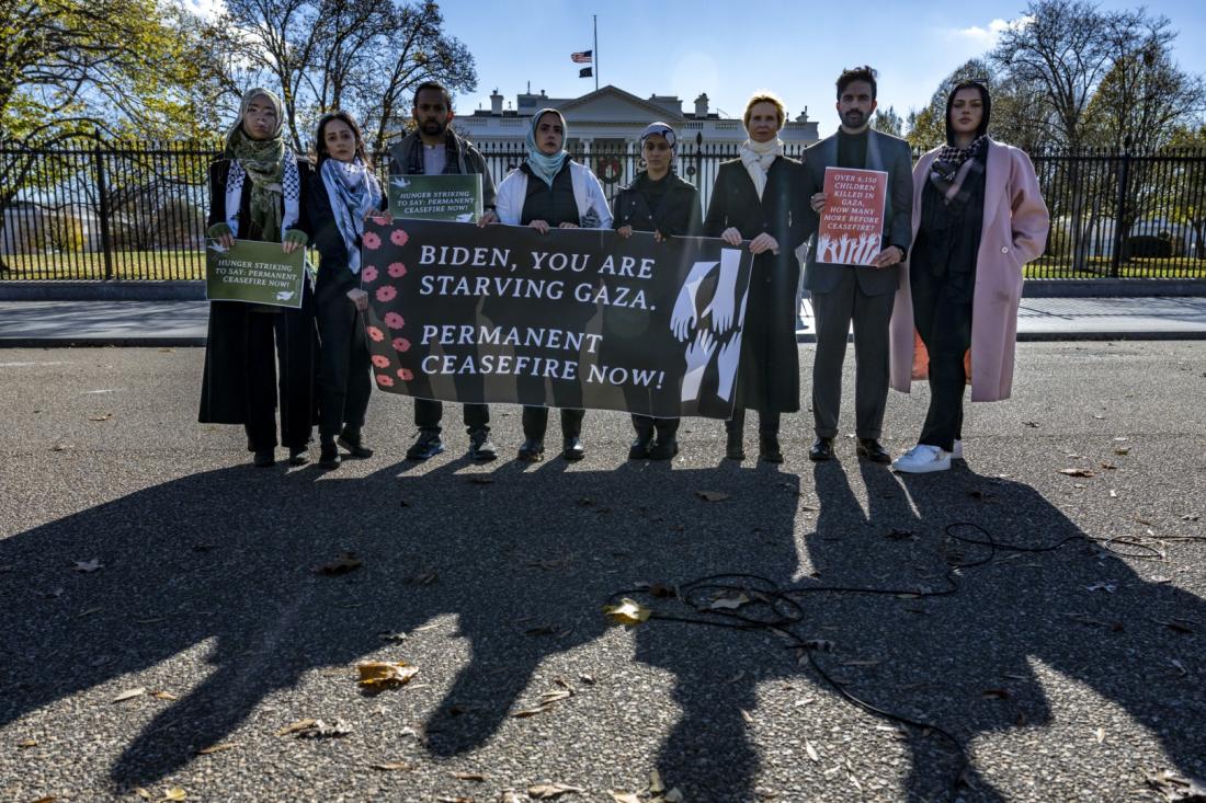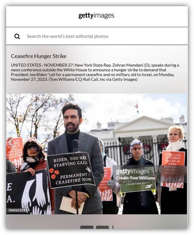 The photo's caption on Getty Images says Mamdani, then a New York state lawmaker, was speaking "during a news conference outside the White House to announce a hunger strike to demand that President Joe Biden 'call for a permanent ceasefire and no military aid to Israel.'"