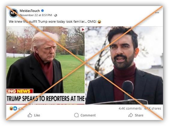 Social media users are claiming a scarf-and-coat combination US President Donald Trump wore after an unexpectedly cordial White House meeting with Zohran Mamdani was a knockoff of a previous outfit from the New York City mayor-elect. But the image of Mamdani in the side-by-side is altered; he was sporting different colors in the original photo from 2023.