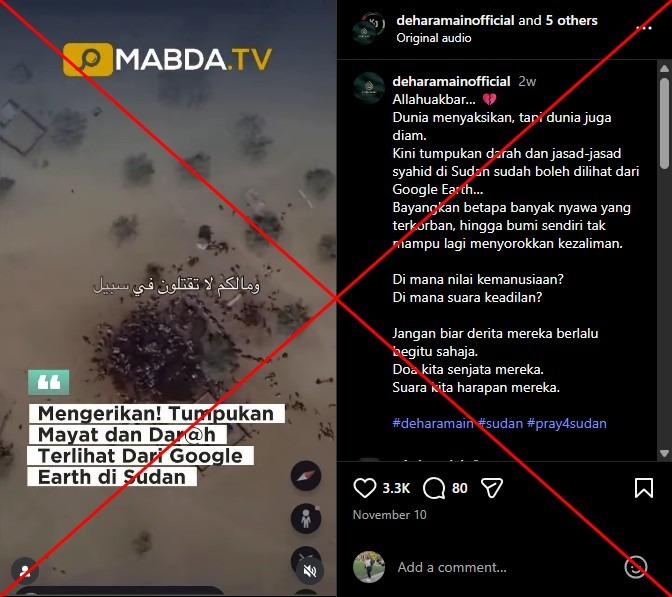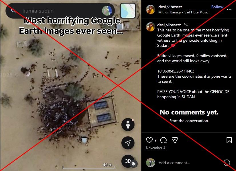"Now the piles of bodies and blood of the martyrs in Sudan can be seen from Google Earth," reads part of a Malay-language Instagram post shared November 10, 2025. The sticker text in the video repeats the claim.