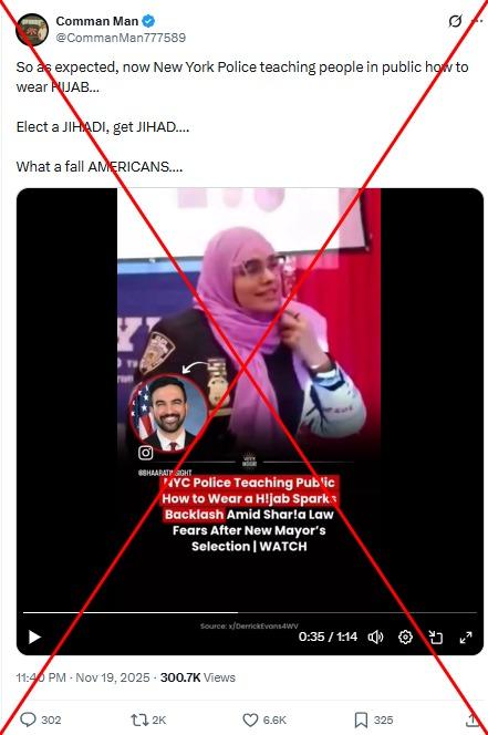 "So as expected, now New York Police teaching people in public how to wear HIJAB… Elect a JIHADI, get JIHAD…. What a fall AMERICANS…." reads an X post shared on November 19, 2025.