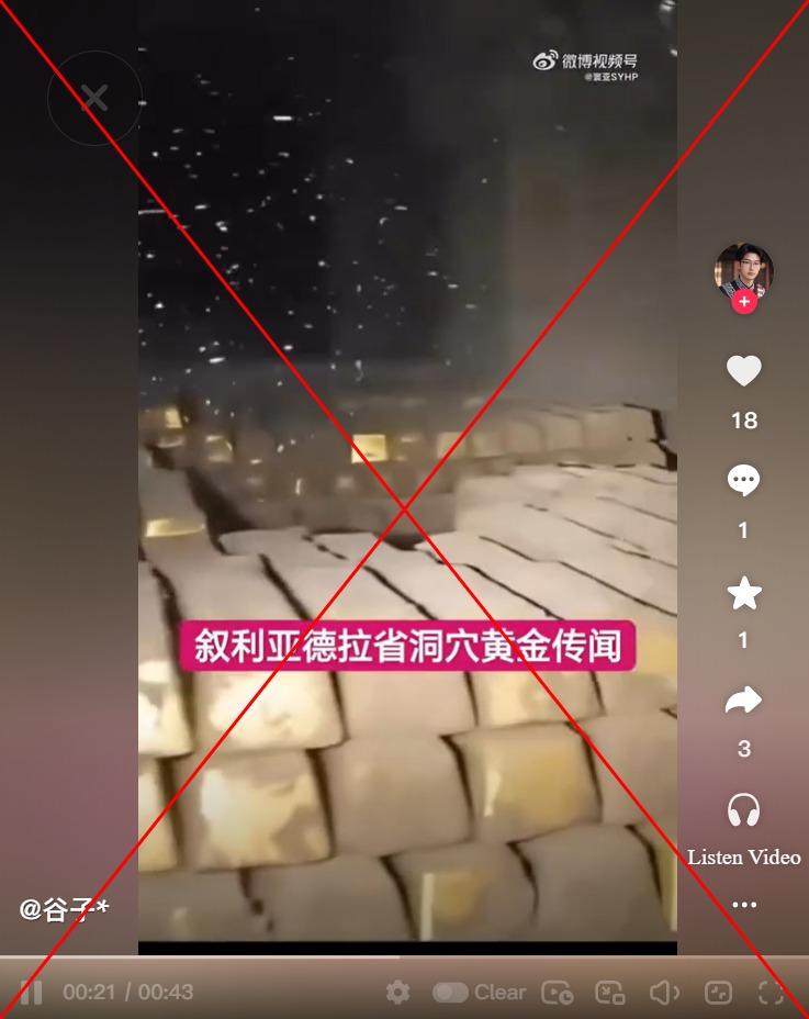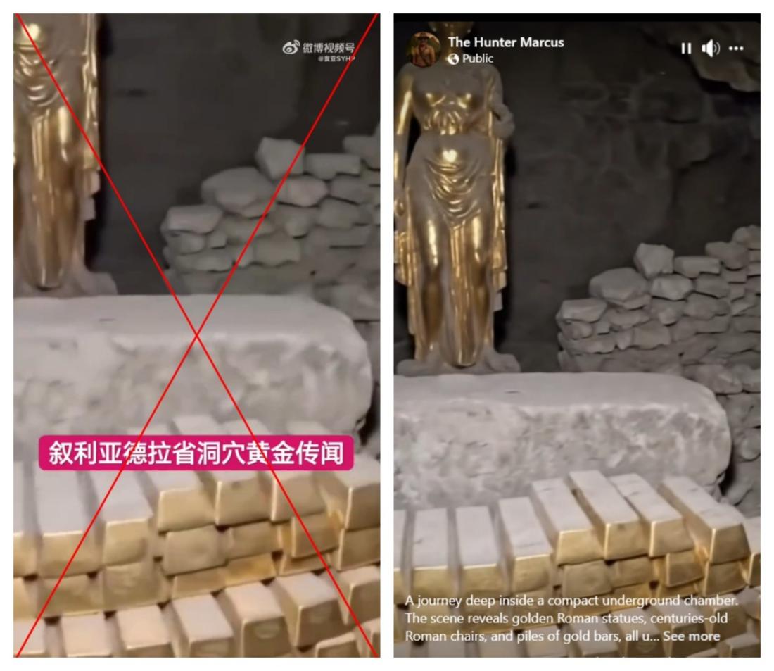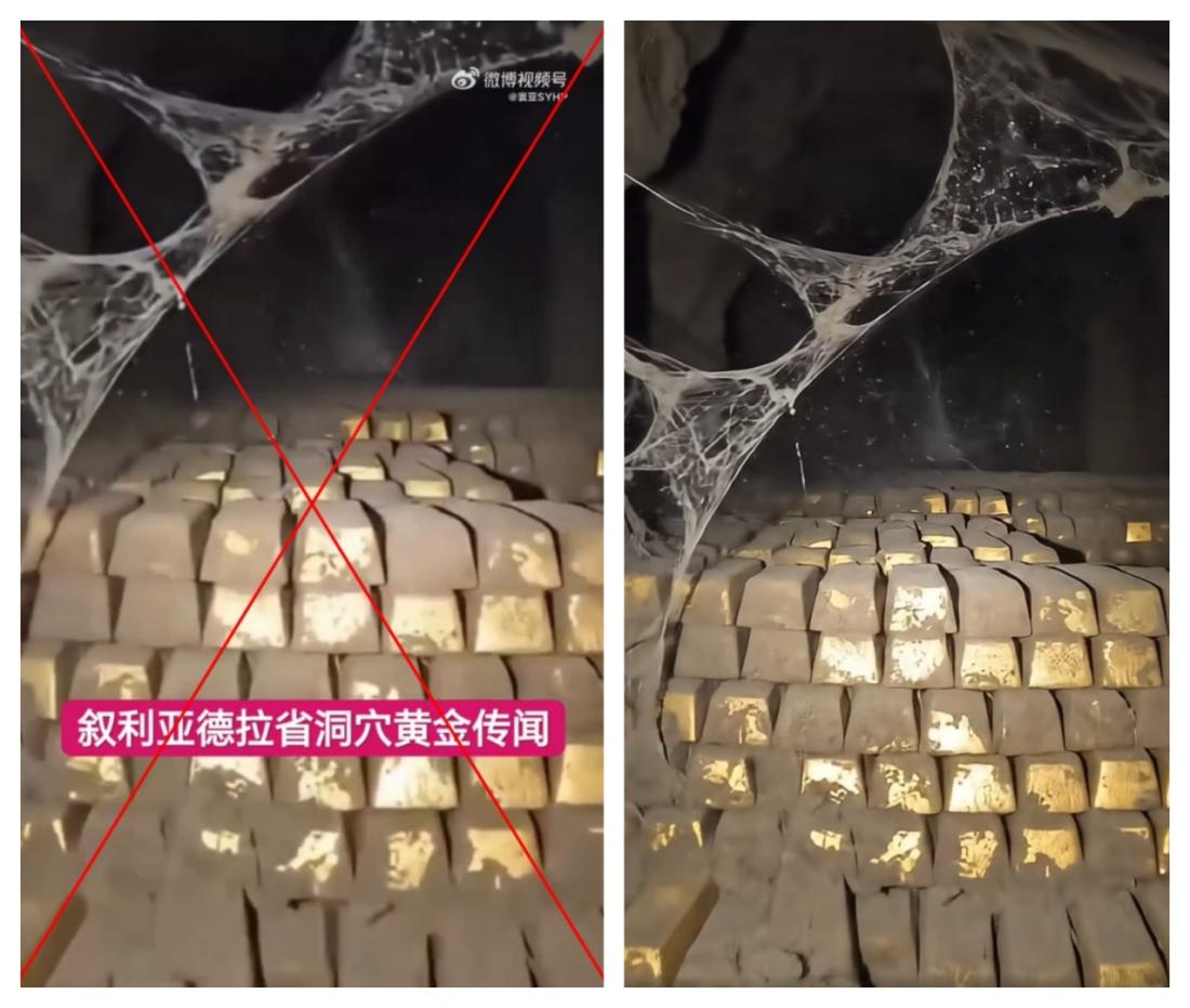 Syrian officials rejected online rumours that a gold-filled cave was discovered in al-Hara in the southern part of the country in November 2025 after locals flocked to the town. But their denial did not deter social media users from believing that fabricated videos circulating online showed the underground chambers filled with the precious metal. The clips contain visual errors and some of them can be traced to a YouTube account that published similar videos marked as AI-generated.