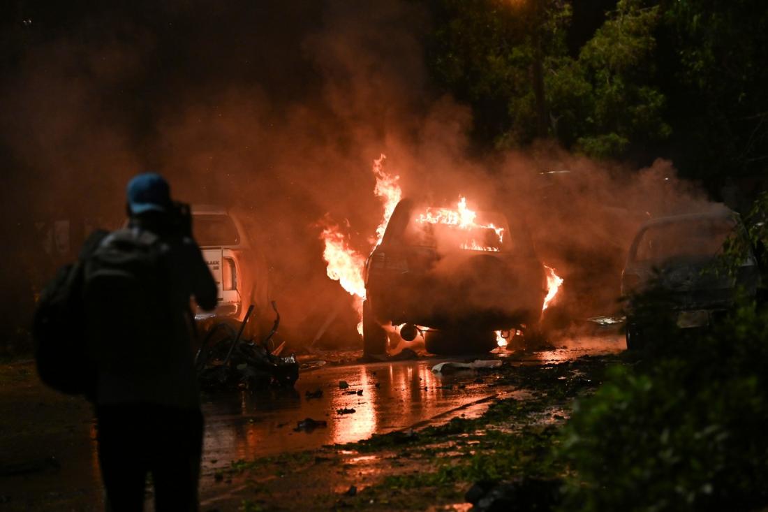 One of the burning vehicles seen in the falsely shared video can also be seen in AFP photos of the aftermath of the explosion.