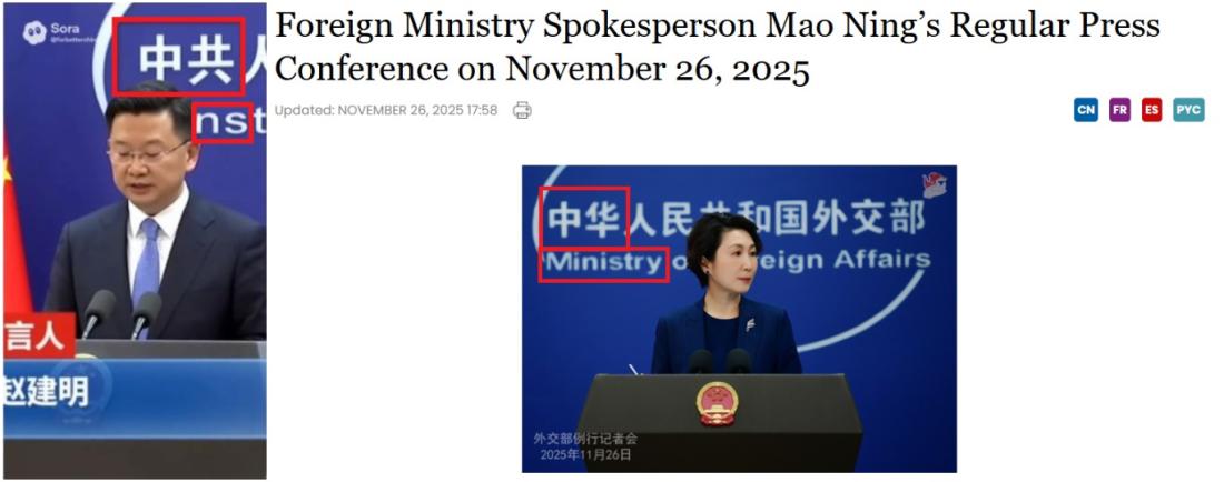 Chinese characters behind the spokesperson in the false video read "Chinese Communist", compared with "Chinese" seen at genuine foreign ministry press conferences (archived link). There is also a missing "i" in the false video where the word "ministry" would be.