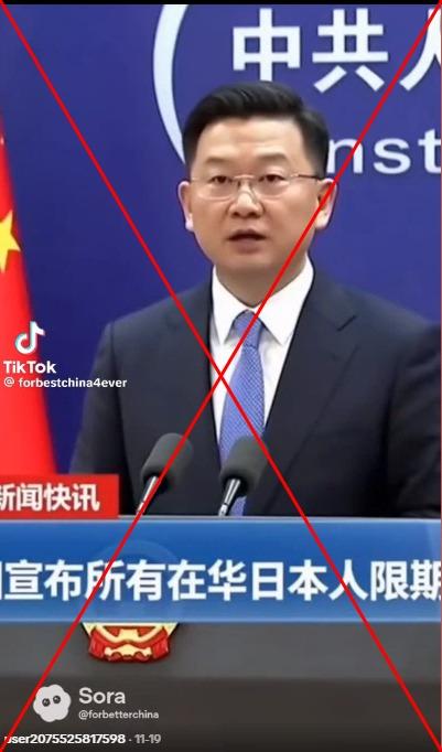 A TikTok video shared on November 19 appears to show a Chinese foreign ministry spokesperson saying in Mandarin: "The government has decided that all Japanese citizens in China must complete their departure procedures by the end of this month."