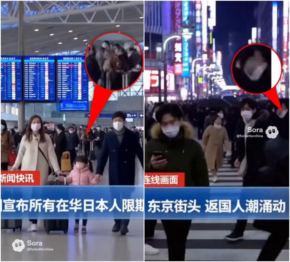 It also contains cropped chyrons that partly read "announced limit on all Japanese people in China" and "Tokyo streets filled with people that had returned to the country".