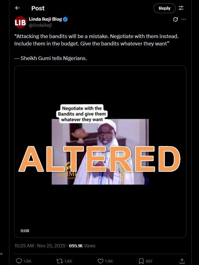 Insecurity in Nigeria has been a major topic since the US government designated the West African country as a "country of particular concern" over claims of religious persecution. A video shared on social media claims to show prominent Muslim cleric Ahmad Gumi asking the government to allocate funds for bandits in the national budget. But the clip is altered; the audio was replaced with an AI-generated voice, and the original video shows a 2021 interview in which Gumi attributed Nigeria’s insecurity problem to a mix of ethnic conflicts and criminality.